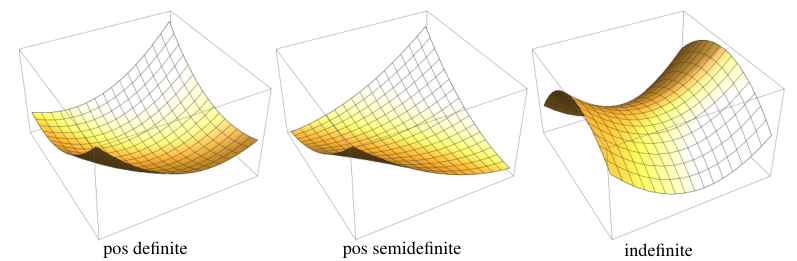 - 如果既不是半正定矩阵又不是半负定矩阵,则 $M$ 是不定矩阵(indefinite matrix)