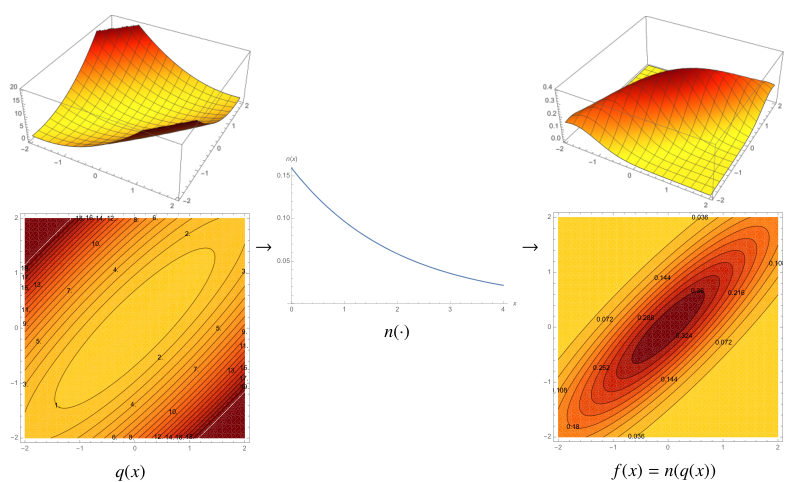 $q(x)$ 是一个中心在 $\mu$ 的柱面,由精度矩阵 $\Sigma^{-1}$ 决定;$n(\cdot)$ 是一个单调凸函数,不会改变等值面的形状(只改变数值,不改变性质和位置,如下图)