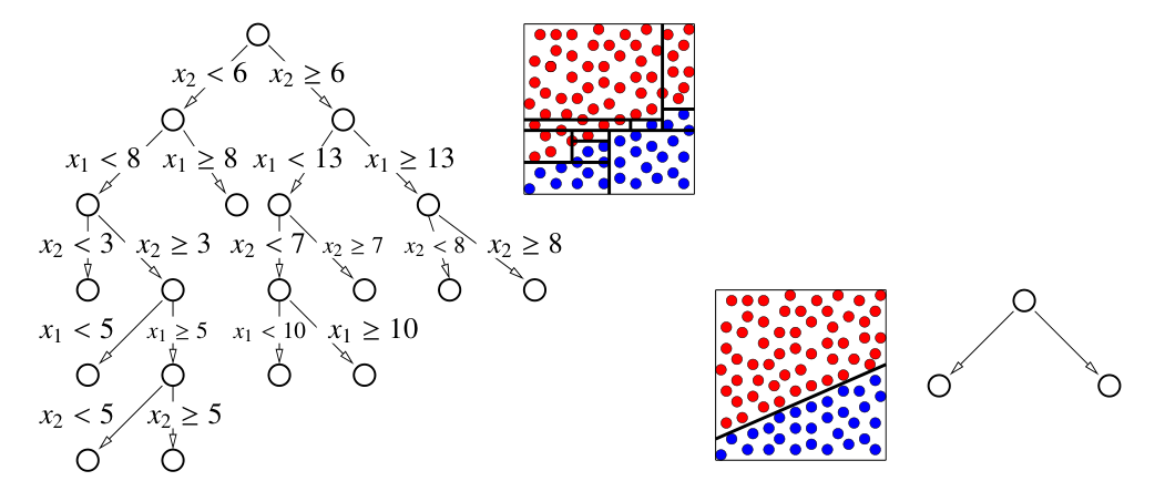 一个标准的决策树一次只对一个特征进行划分(如左图),对于 SVM 可以轻易区分的斜线,决策树需要学习一个非常复杂的规则