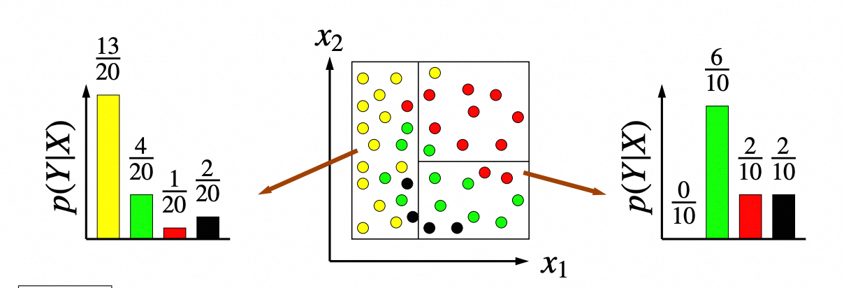 此外叶子节点不那么纯净,往往能包含更加丰富的信息。例如,对于上图的决策树划分,我们可以通过统计每个子区域内不同类别的点数,得到某种类别被分到该叶子节点的概率。对于分类树,直接去概率最大的类别最为叶子节点输出的类别;对于回归树,使用平均值作为叶子节点的预测值