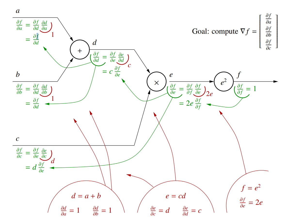 对于公式 $f=((a + b) c)^2$,可以将其拆解成链式传播的形式,然后从 $f$ 开始逐次求解每个节点的梯度
