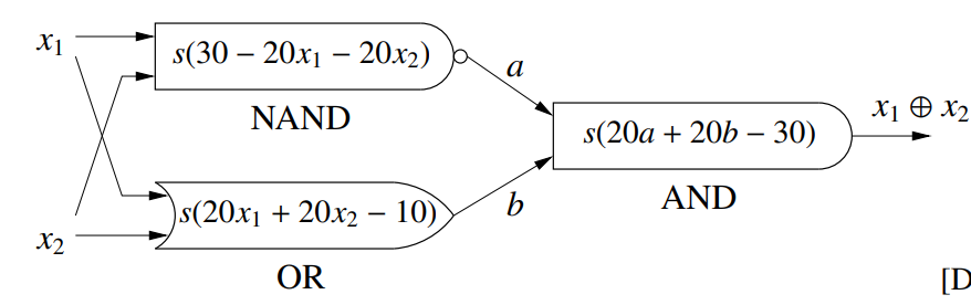 当然,我们也有更佳的方法,通过多个单层线性分类器的叠加可以实现类似电路的逻辑连接,此外在每个线性分类器的输出添加一个非线性的函数 $s$ 可以实现类似电路逻辑门。所以通过多个线性连接+非线性函数(一般为 logistic 函数)可以轻易实现异或,其中每个线性线性连接+非线性函数组成了一个神经元