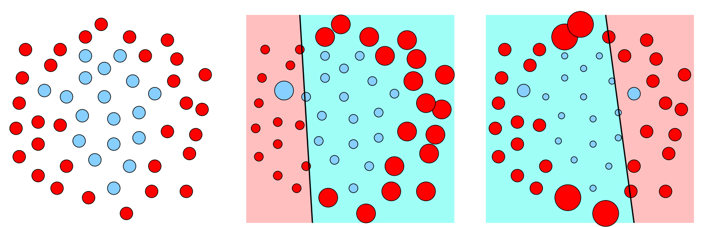 如上图所示,初始时我们为每个训练样本施加相同的权重,然后根据分类器分类正确与错误的情况减小或者增加权重